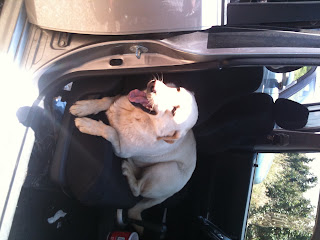 That wasn't the funny part though. We looked around at the cute picnic benches with trellises above, admired the view of the vinyards, and took lots of pictures. We said good-bye to the sweet puppy and tried to get in the car to leave, but apparently, he had no intention of staying in Altus. He hopped right in the passenger seat of the car. It took about 10 minutes of coaxing, pushing, and scolding to get the dog out of the car. Instead of helping to get the dog out, I was taking pictures of the whole incident and laughing at the others attempts. :)